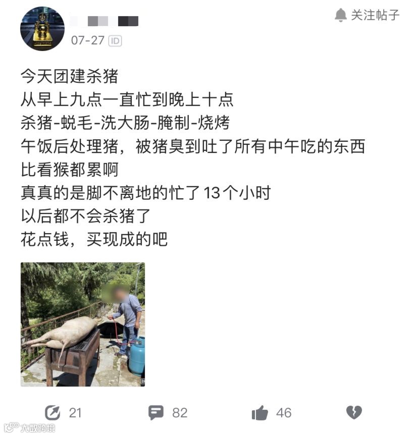 杀猪-蜕毛-洗大肠-腌制-烧烤,一套流程下来,比加班还累不说,还被恶心到吐……