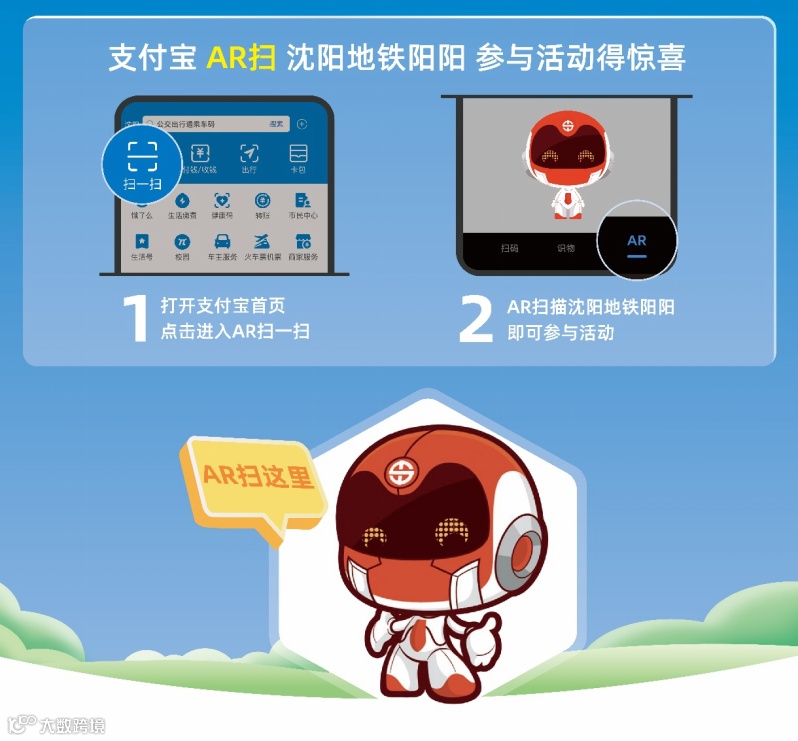 乘客通过手机支付宝AR扫沈阳地铁阳阳形象,进入AR打卡活动,沈阳地铁新线限定皮肤、数量有限,先到先得。同时还有还有最低 1分钱 享五大权益超级出行卡包含(高德打车券5元*2张 哈喽骑行券0.5*4张 火车票购票券3元*1张 公交乘车券2元*1张 地铁乘车享9折)等5大场景权益。赶快去扫吧~