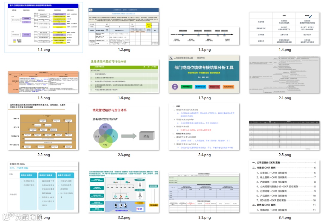 绩效管理的全流程资料,包括绩效管理制度、绩效指标与绩效考核、绩效面谈与绩效运用。附赠内容还包括OKR专辑和大量的实用绩效表单。