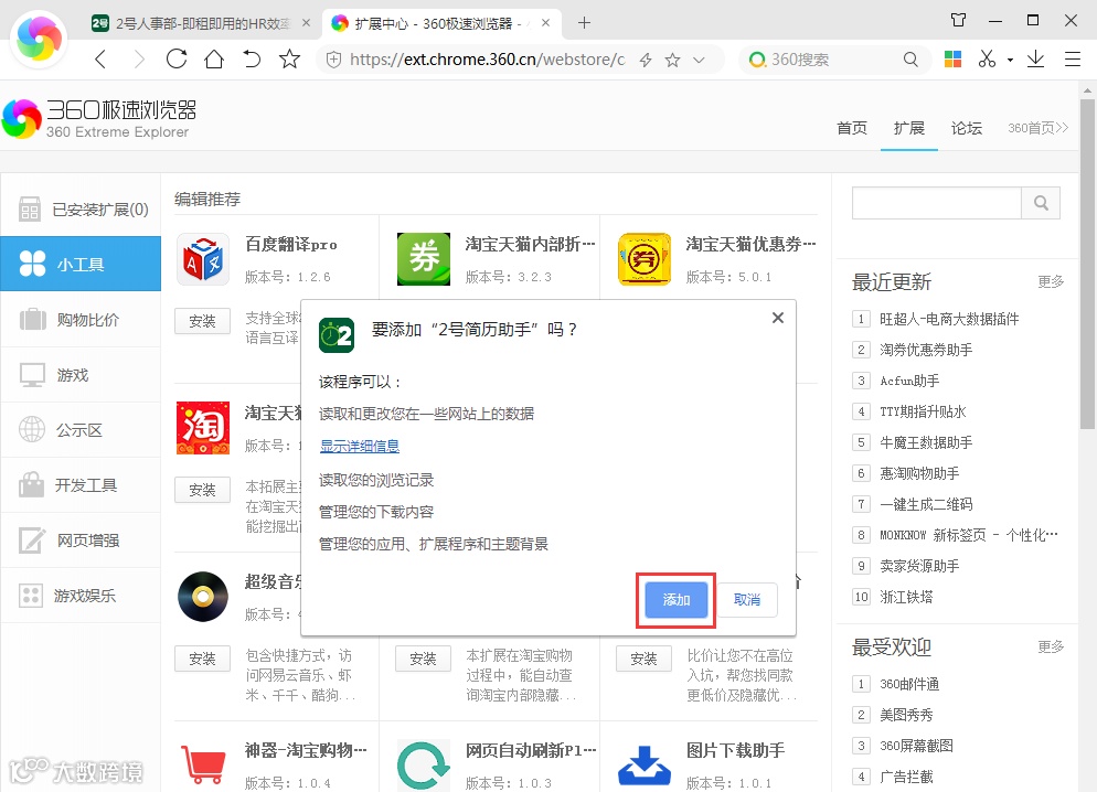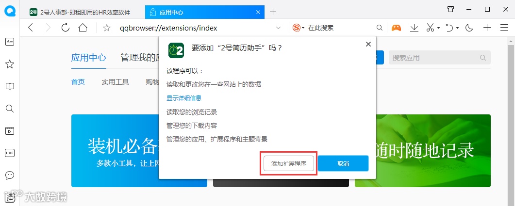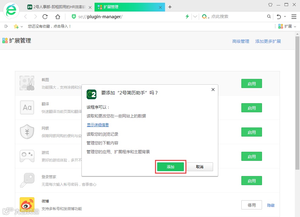2、把下载的简历助手安装包拖入页面,在弹出的弹窗中点击【添加】按钮即可完成安装