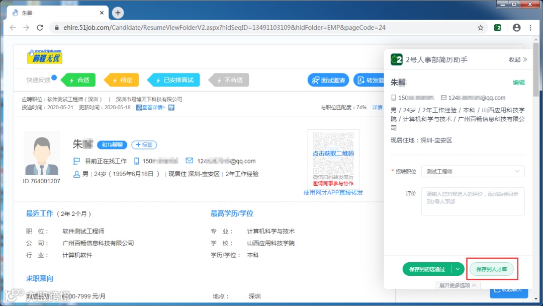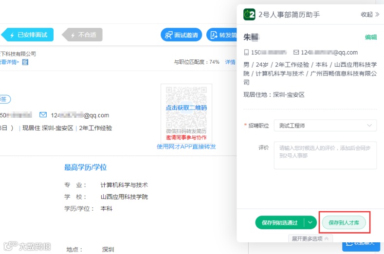 选择招聘职位(必填)、填写备注(非必填)后,可以点击【保存到人才库】按钮,将简历保存到2号人事部人才库,填写的备注信息将保存为候选人评论,在候选人详情页的操作记录中可以查看。