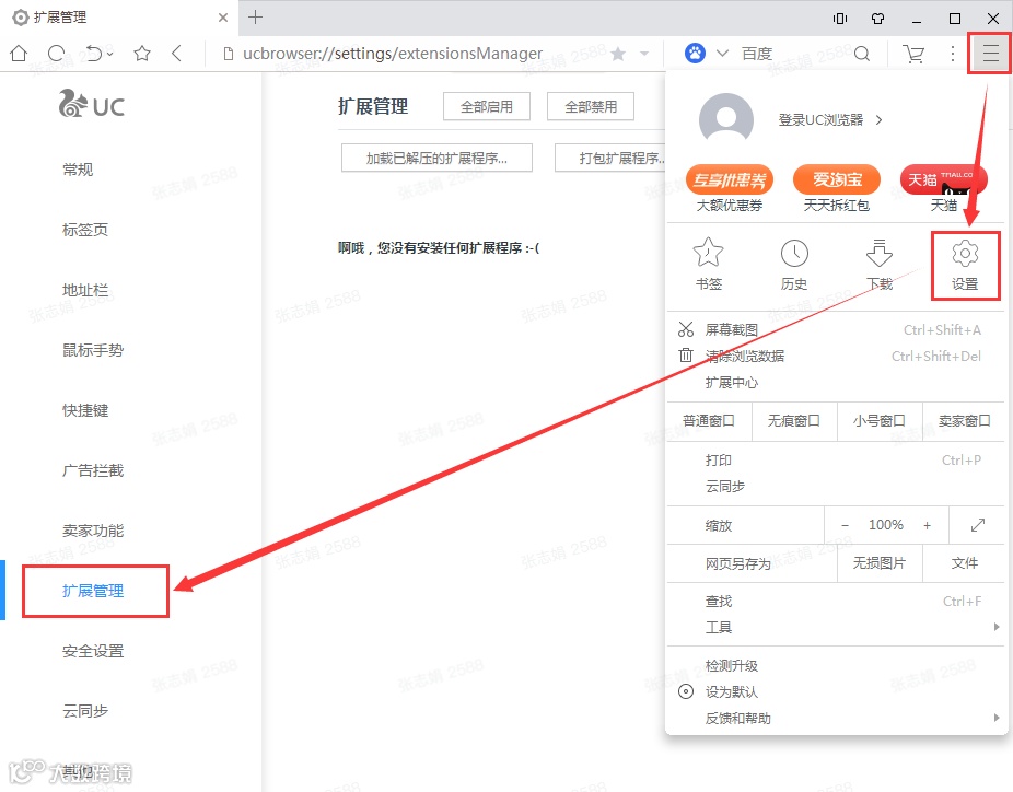 2、点击浏览器菜单的设置->拓展管理,或者直接在地址栏中输入ucbrowser://settings/extensionsManager 进入拓展管理页面