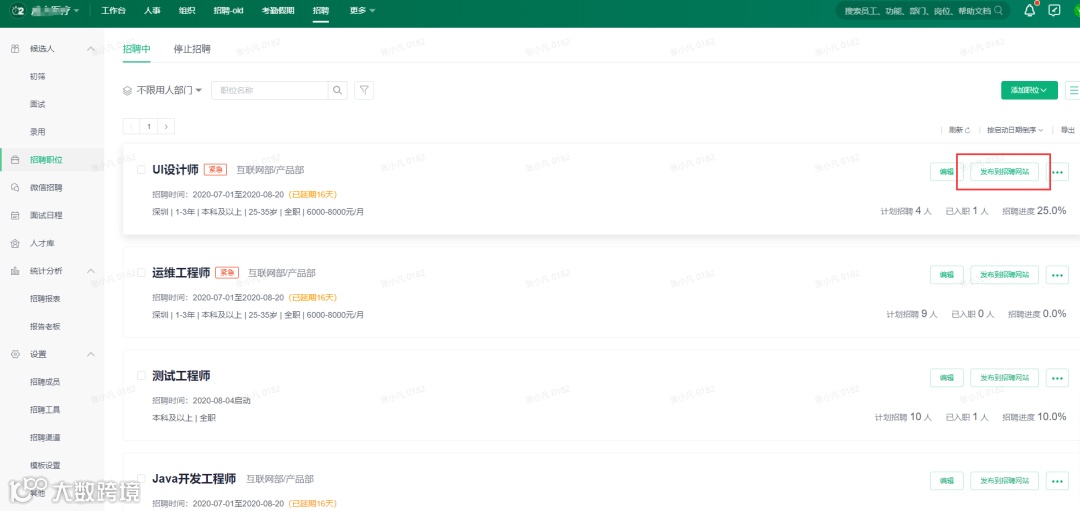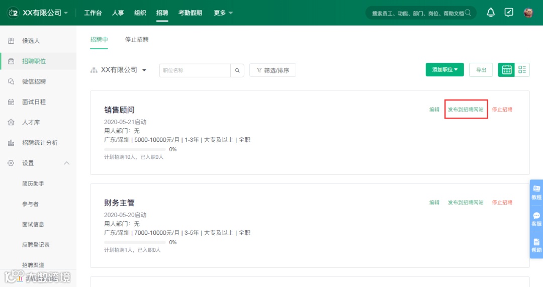 在招聘中的招聘职位列表和详情页,点击“发布到招聘网站”按钮,如果企业未设置过需要的招聘网站,需要先设置。