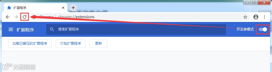 2、打开“开发者模式”开关(如果是首次打开开发者模式,需要将扩展程序页面手动刷新一次)