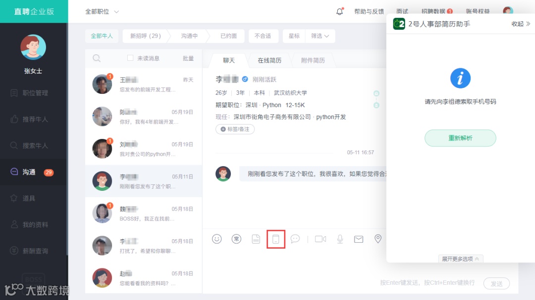 答:未获取到候选人手机号的简历无法解析,请在BOSS直聘聊天窗口中,点击【交换手机号】,获取到候选人的手机号后再进行简历解析。