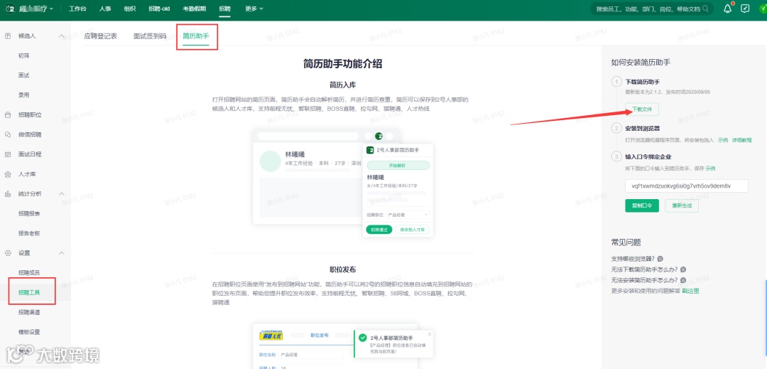 1、在招聘—>设置—>招聘工具—>简历助手页面,点击【生成口令】按钮,再点击【复制口令】按钮复制口令