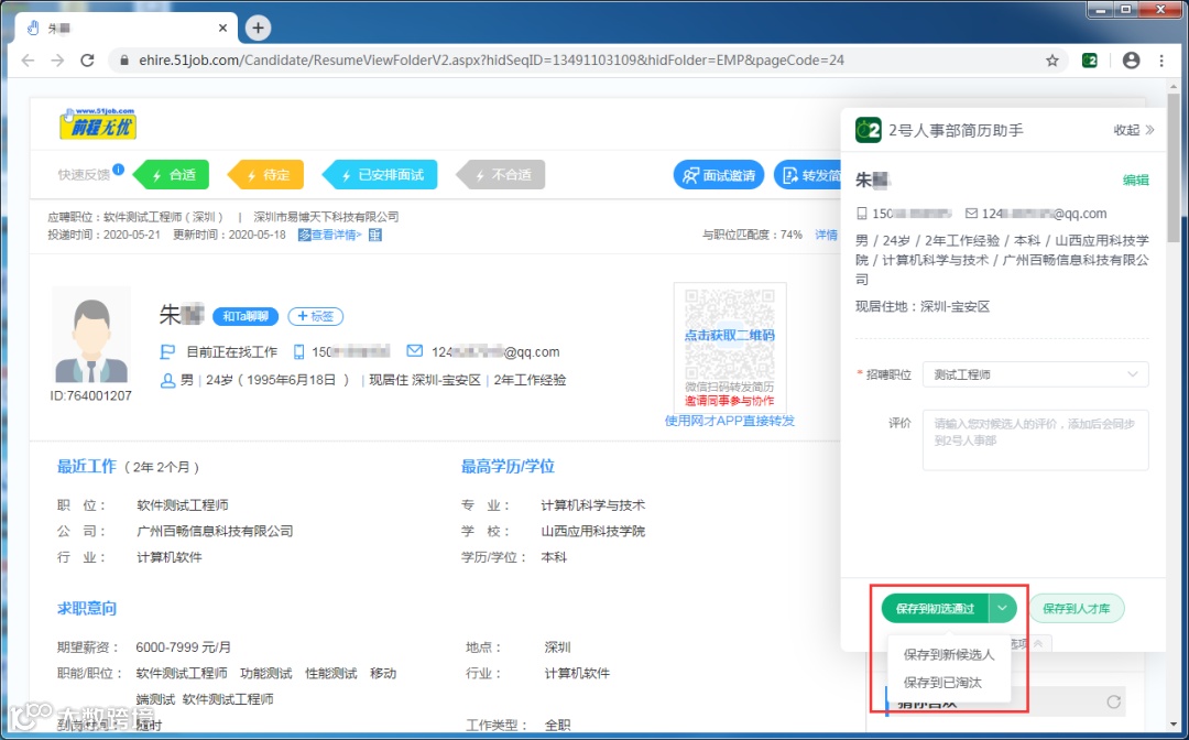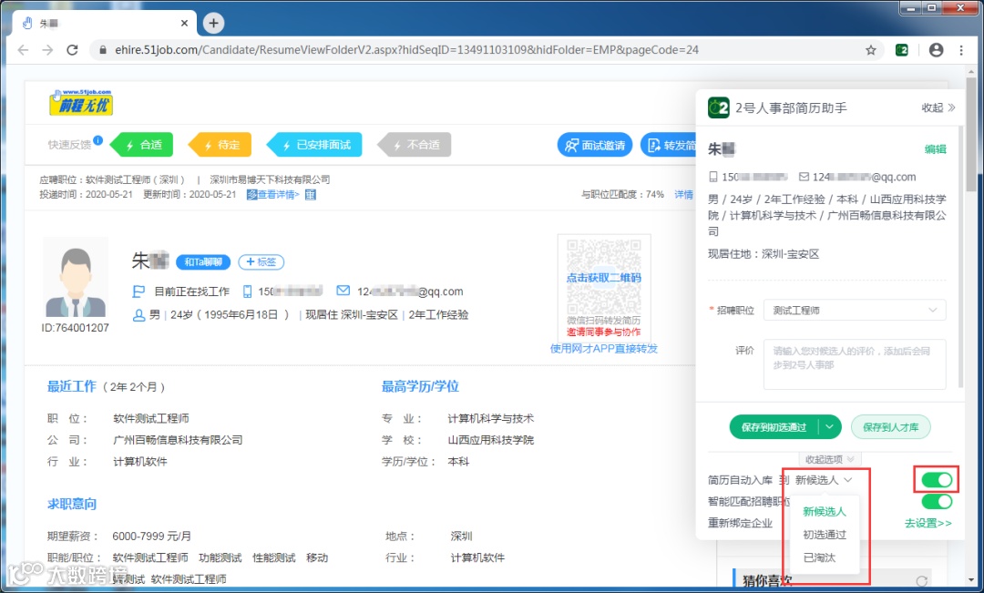 如果2号人事部的候选人中存在相同姓名+手机号+招聘职位的候选人,简历助手会自动弹出提示,您可以操作【更新候选人】,更新候选人会将简历更新到2号人事部的此候选人页面。