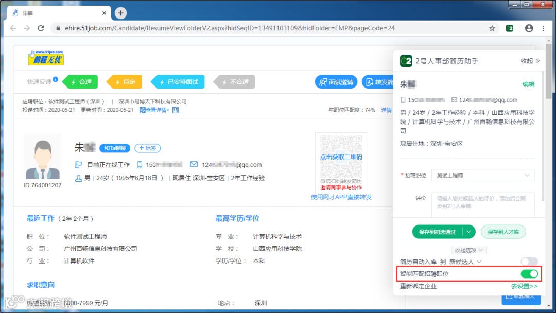 在招聘网站打开一份简历,简历助手会自动解析简历,提取简历内容。