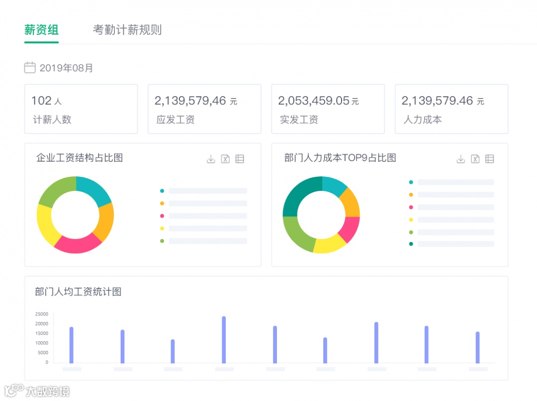 来来来,2号人事部告诉你答案!2号人事部薪酬管理模块涵盖了全流程多数据场景,针对职位全方位深入分析,生成多维度的薪酬分析图,各类薪酬报表,社保公积金每月缴费人员统计、成本统计。将多维度的数据分析形成可视化面板,HR和管理者都可直观地看到个人或者团队的薪酬分析。