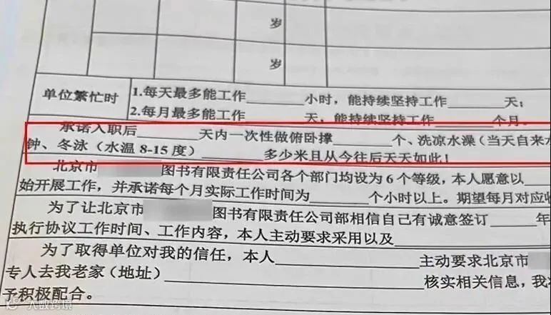 某网友在应聘北京某图书公司的运营岗位时,发现公司以“帮助员工锻炼强健的体魄”为由,要求他签署承诺书,上面赫然写着:“入职后____天内一次性做俯卧撑____个、洗凉水澡___分钟、冬泳___米,且从今往后天天如此!”