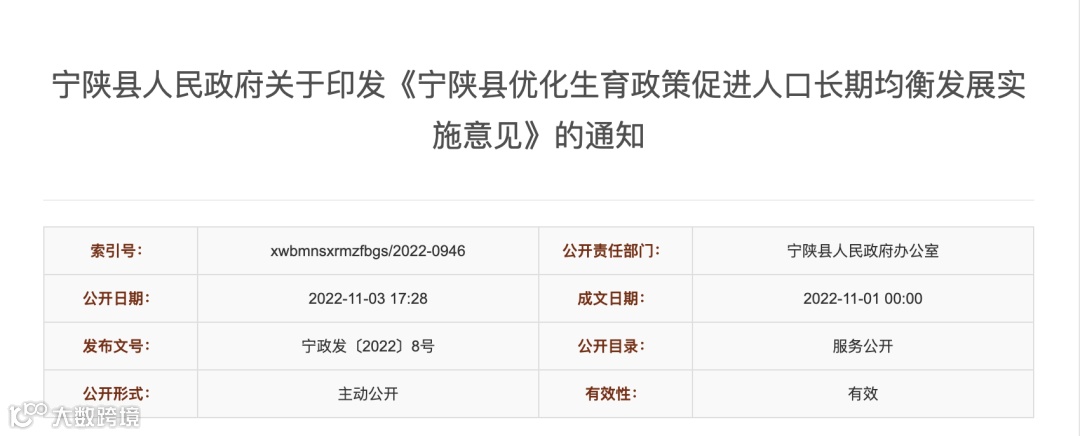 2022年11月1日,陕西省安康市宁陕县人民政府印发《宁陕县优化生育政策促进人口长期均衡发展实施意见》(下称《意见》),提出优化生育、养育、教育政策。意见于2023年1月1日正式执行。