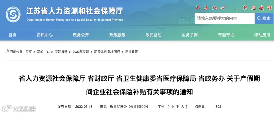2022年5月13日,江苏省人社厅也发布《 关于产假期间企业社会保险补贴有关事项的通知》,明确2022年2月10日后,女职工生育二孩、三孩的,为其在产假期间缴纳社会保险费的企业可以享受社会保险补贴。