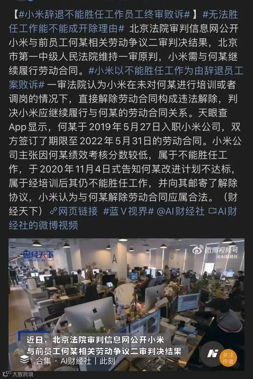 前一段时间,“小米辞退不能胜任员工终审败诉”登上微博热搜。