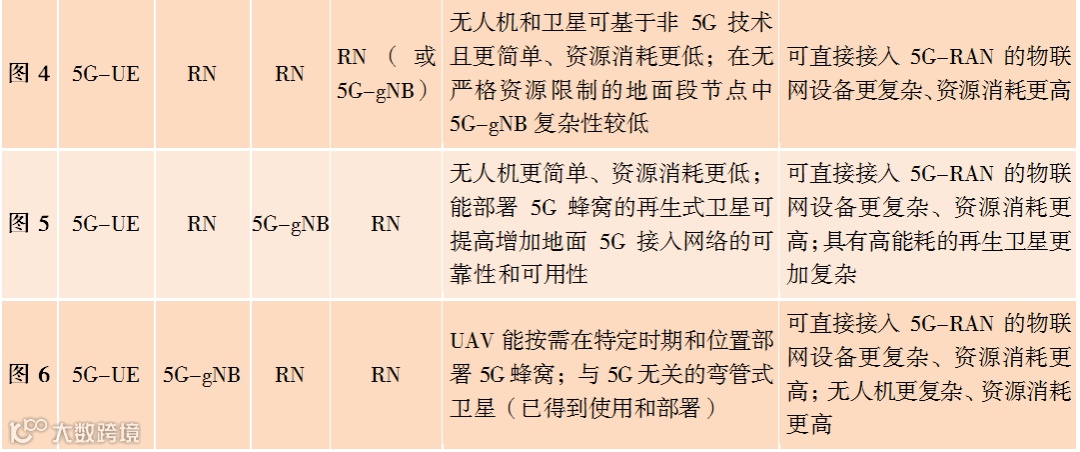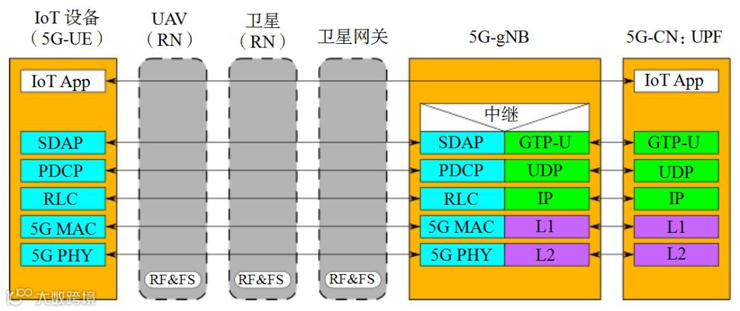 图4 5G-UE在IoT设备中,无人机和卫星作为RN,5G-gNB在地面