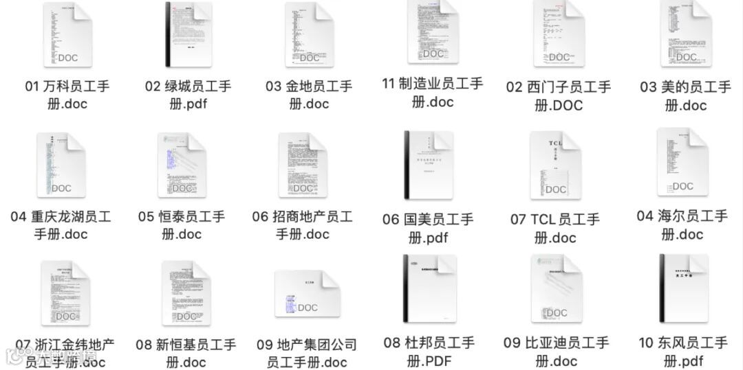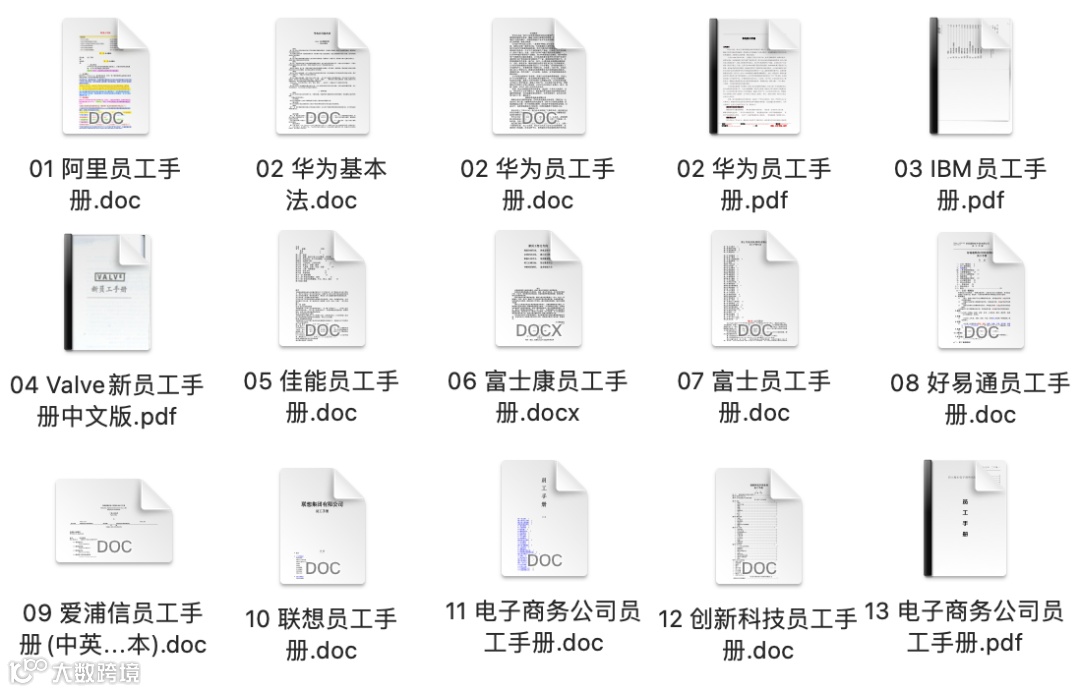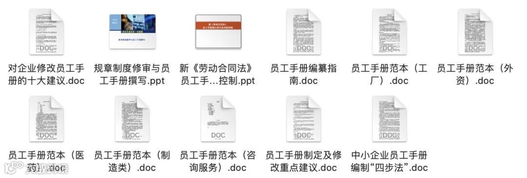 资料包含员工手册模版大全、编纂指南、名企文化手册,以及八大热门行业员工手册。