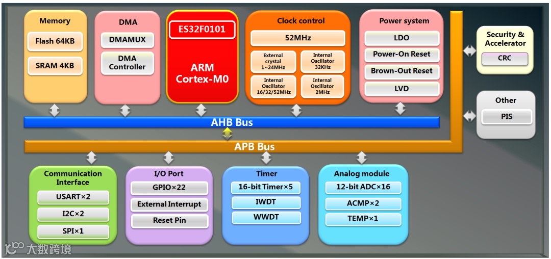 ES32F0101是采用ARM 32位Cortex-M0内核的微控制器,最高支持52MHz系统时钟频率。具有64KB FLASH和4KB SRAM。支持多达22个IO,支持1路12Bit ADC,2路模拟比较器。带丰富的定时器资源,包含1路高级定时器(AD16C4T),3路通用定时器(GP16C2T),1路基本定时器(BS16T)。支持丰富的通信资源,包括2路I2C,1路SPI,2路USART。
