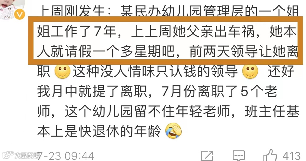 看到一个网友的故事。她曾是一家幼儿园的老师,同事的父亲出了车祸,本来只是想请一周假,可领导却让同事直接办离职。她还说那个幼儿园根本就留不住人,一个月内就走了五个老师。