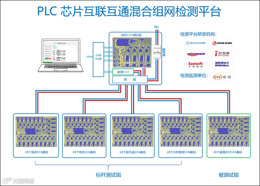 目前,海思、联芯通、物奇、东软载波等已经完成了按互联协议版本的芯片的开发,并联合进行了混合组网检测平台的搭建,通过用实际测试中出现的问题或未完善的地方,来协助PLC标准委员会进一步优化升级PLC芯片互联协议,对于协议可运用性落地有着十分重要的意义。