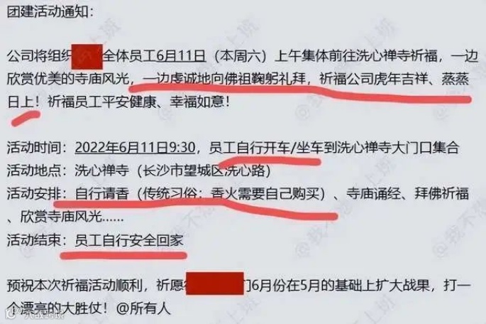 网友分享了自己公司的团建。三个自行,自行开车前往寺庙集合,自行请香,自行安全回家;两个祈福,为公司祈福蒸蒸日上,为自己祈福平安健康。
