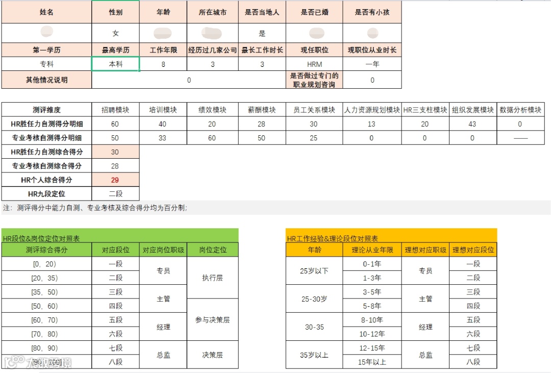 比如很多刚升任主管,在主管层停留不前的HR,就是通过这份自测表,发现自己胜任力九段测评总分为二段,连主管入门水平都没达到。