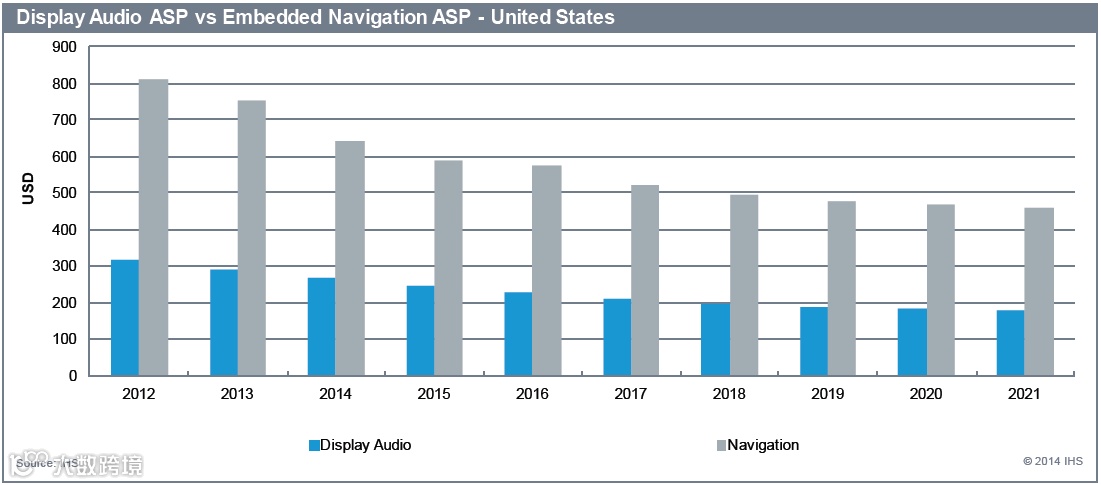 The figure above highlights why display audio is a big disruptor for embedded navigation in the U.S..The average selling price for a display audio system is between $200 and $300 compared to navigation which in 2012 was over $800,but even at its lowest point barely goes below $500.Assuming the consumer has the option between an embedded navigation system at $500,or a display audio system with a navigation app at $200,it is fairly obvious what the choice will be.