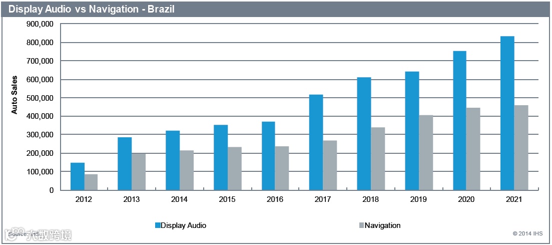 Just like the U.S. Though,Brazil is seeing more growth in display audio systems than in embedded navigation.Display audio is a major disruptor in this market as it provides a low-cost solution for navigation in a market where cost is crucial.