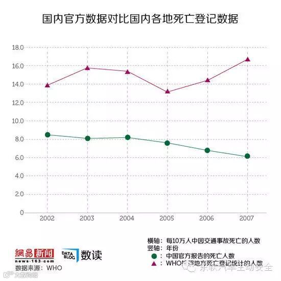 据报道,中国是每年因交通事故死亡人数最多的国家,而且居首多年。实际上,即使如此惊人,公安部每年公布的交通事故数量尤其是交通事故中的死亡人数,从许多年前就遭到了包括世界卫生组织WHO在内非官方统计的质疑。