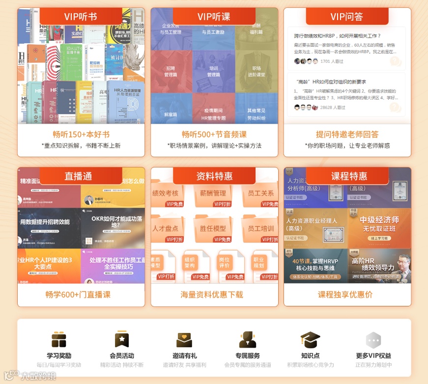 0元直播课:1000+节HR大咖直播课,定期分享HR大咖直播,畅学1000+门直播课,覆盖人力资源各大模块。 VIP专属特权11+个:独属于三茅VIP的权益,包含大咖问诊、课程折扣、考证折扣等...