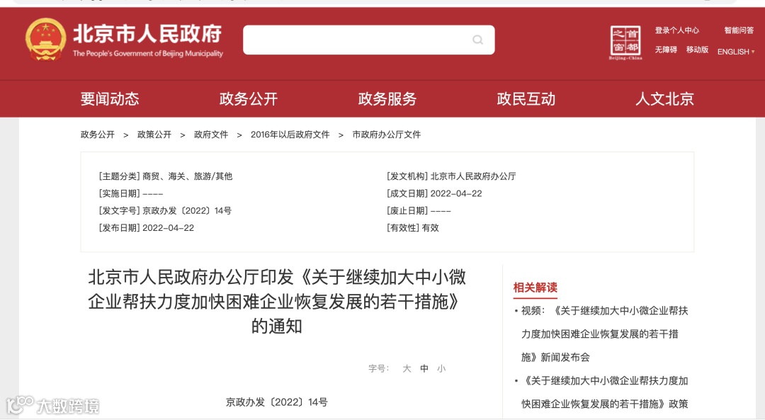 北京市人民政府办公厅印发《关于继续加大中小微企业帮扶力度加快困难企业恢复发展的若干措施》的通知 京政办发〔2022〕14号