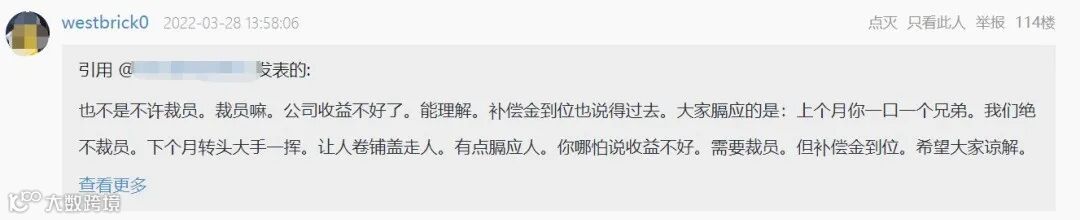 虎扑网友@westbrick0同样认为,裁员只要补偿到位都说得过去,但是前言后行两张皮,就让人“膈应”。