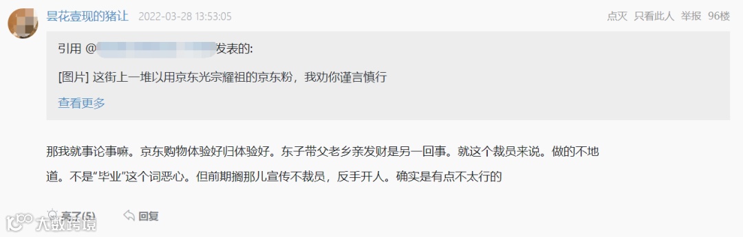 甚至有些认同京东的体验,认同刘强东带父老乡亲发家致富的举动的网友,也觉得“京东一边宣传不裁员,一边反手开人”的行为不地道。