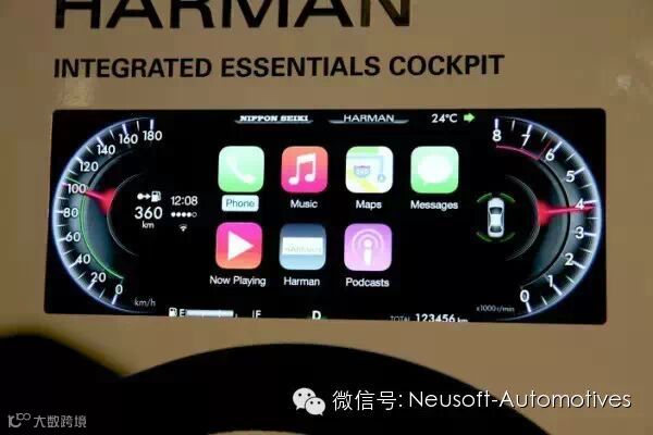Harman今天推出了采用苹果CarPlay汽车操作系统的概念驾驶舱,不过却摒弃了中控触摸屏,而是把苹果的CarPlay界面直接集成到方向盘后面的仪表盘上。CarPlay用户界面在左侧车速表和右侧转速表之间,界面下方是温度计,燃油表和里程表。