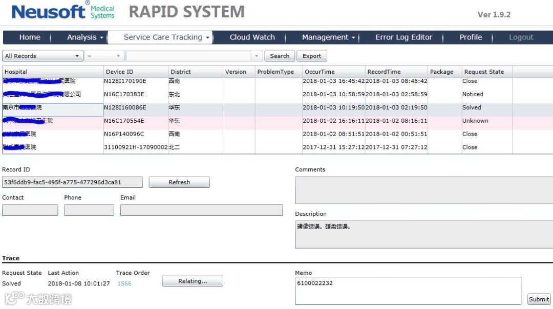 ”一键报修”管理功能基于远程服务平台,从接到报警到处理完毕,所有过程详细记录,保证良好服务质量。1月3日南京某医院通过”一键报修”发出报修信息”建像机错误,硬盘错误”。TSE接到信息后马上联系用户,经远程清理建像机硬盘后,设备恢复使用。工作过程都记录于远程服务平台。