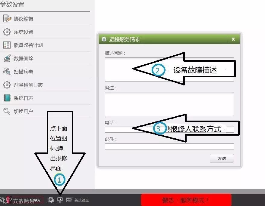 安装远程服务功能的用户先确认CT设备已经联网在线,如果屏幕左下角出现电脑图标(如下1所示),点击它就可以操作”一键报修”功能了。