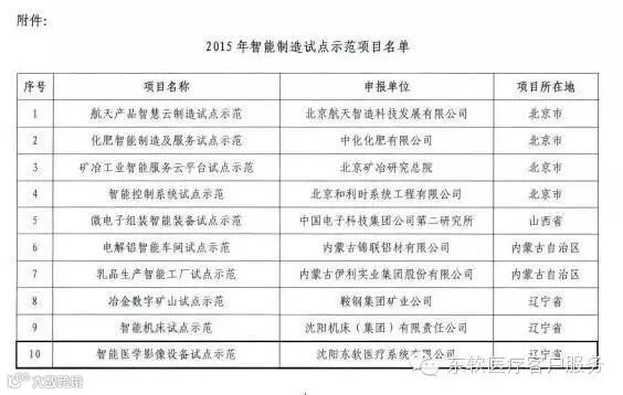 2015年07月21日,工业和信息化部公布2015年智能制造试点示范项目名单,全国共有46个示范项目入围。其中,东软医疗“智能医学影像设备试点示范”项目正式入选,而东软医疗也是唯一入选该名单的大型医疗设备生产制造企业。