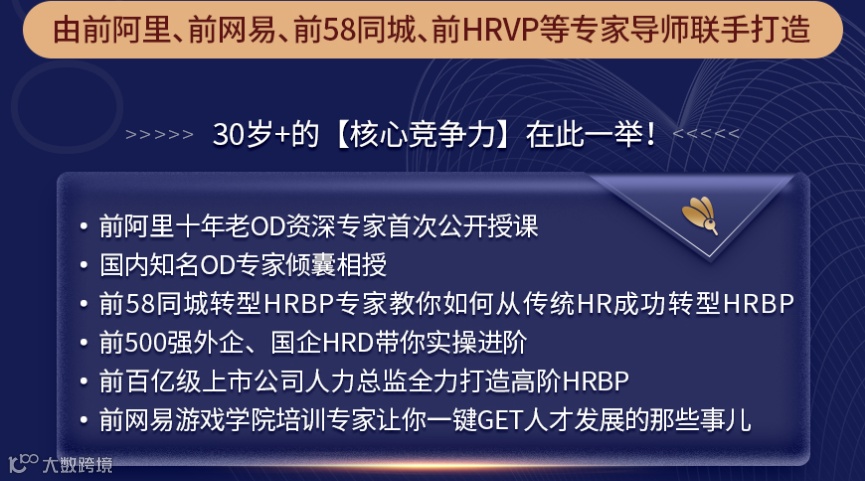 前阿里、前网易、前58同城、前HRVP等专家导师联手打造,基于强大的名企的背景,以及作为人力资源高管支持业务的成功经验,完美结合业务和HR特点,在课程中剖析HR面临的挑战和困惑,使学员受益。