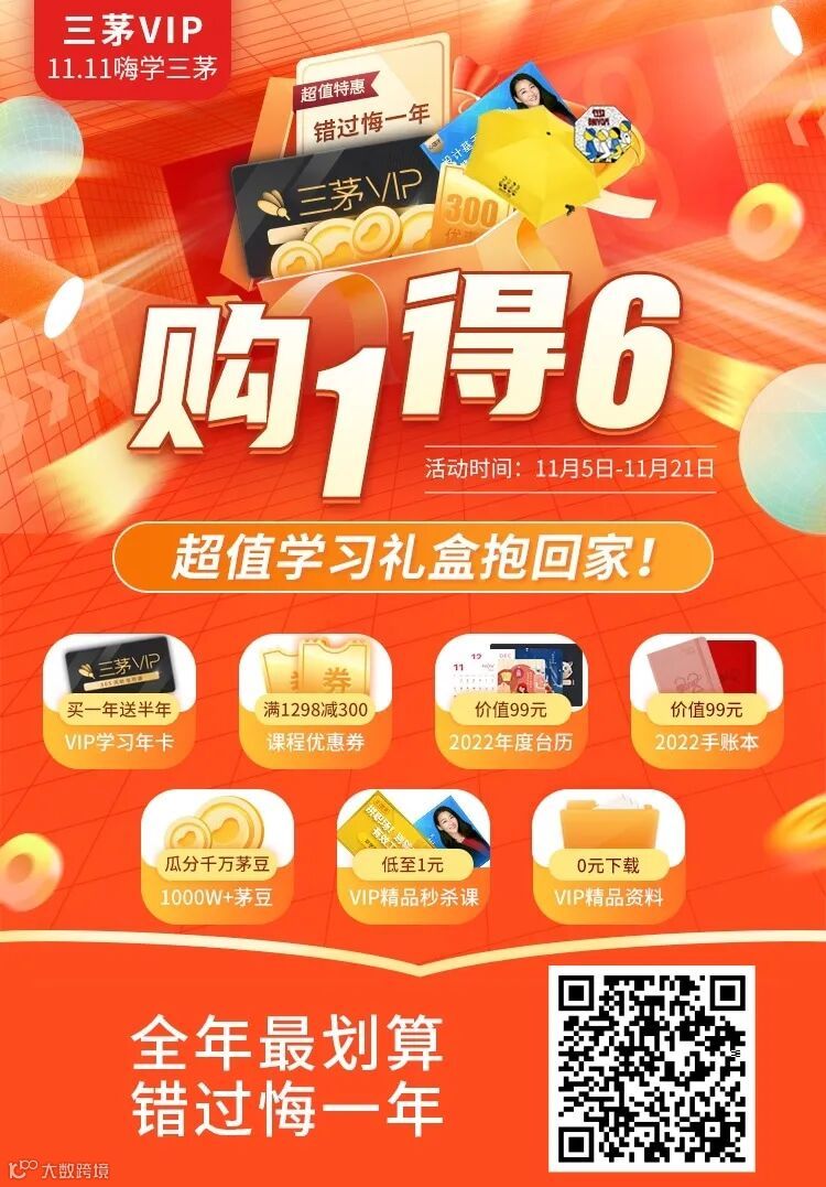 购买三茅VIP秒到账,全系列课程通用!有效期1个月内,全系列课程通用,满1298即可减300!