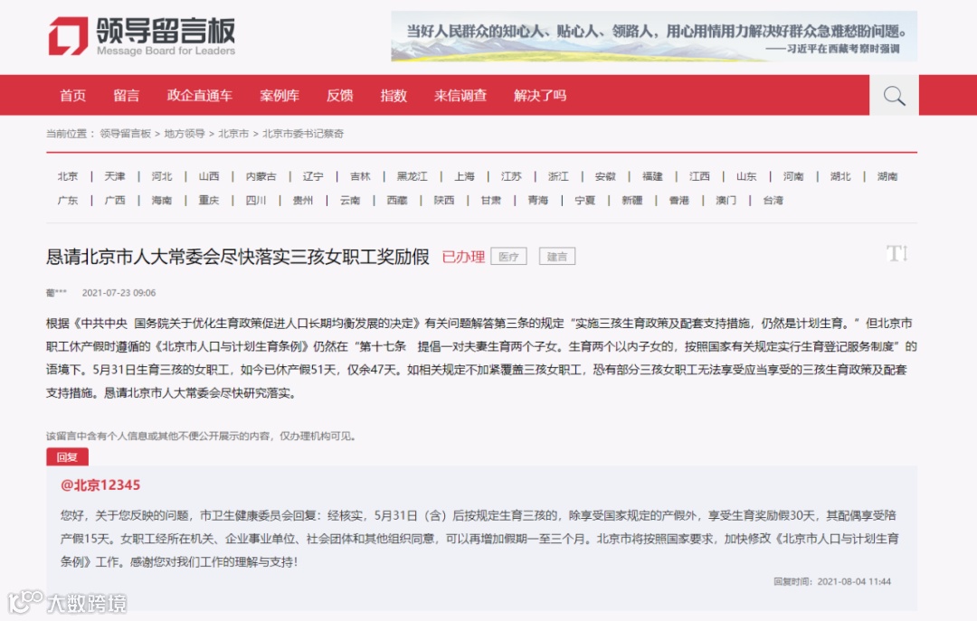 8月4日,“北京12345”援引市卫生健康委员会消息称:经核实,5月31日(含)后按规定生育三孩的,除享受国家规定的产假外,享受生育奖励假30天,其配偶享受陪产假15天。
