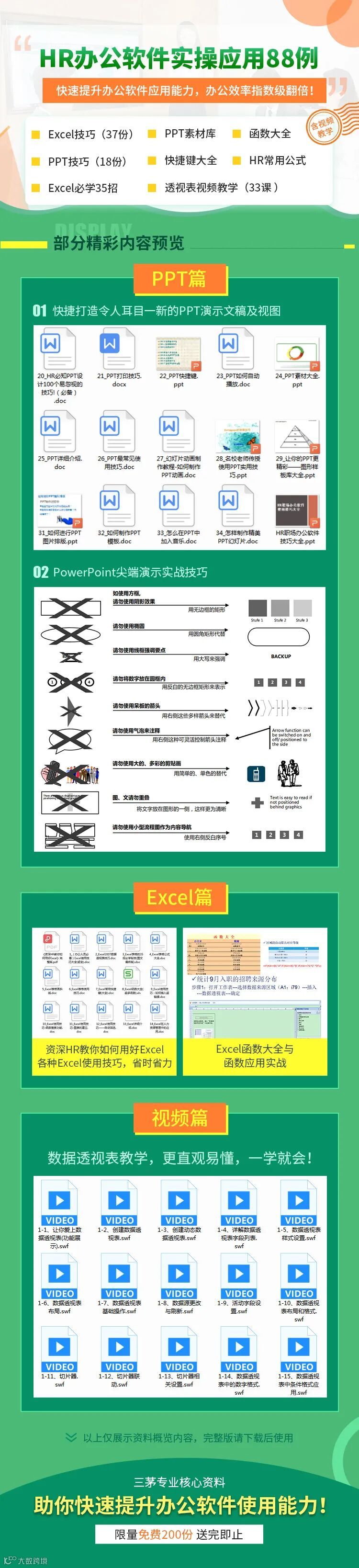 内容涵盖Excel&ppt使用技巧类55份,PPT素材库,函数大全和函数使用技巧,各种办公软件快捷键使用大全,HR常用公式,以及33个课时的透视表视频课,无论是初入职场的新手还是浸润多年的老司机,都能学到之前没学过的知识和技能!