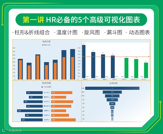 课程第一讲《HR必备的5个高级可视化图表》,全动态教学,包含了柱形&折线组合、温度计图、旋风图、漏斗图和动态图表。