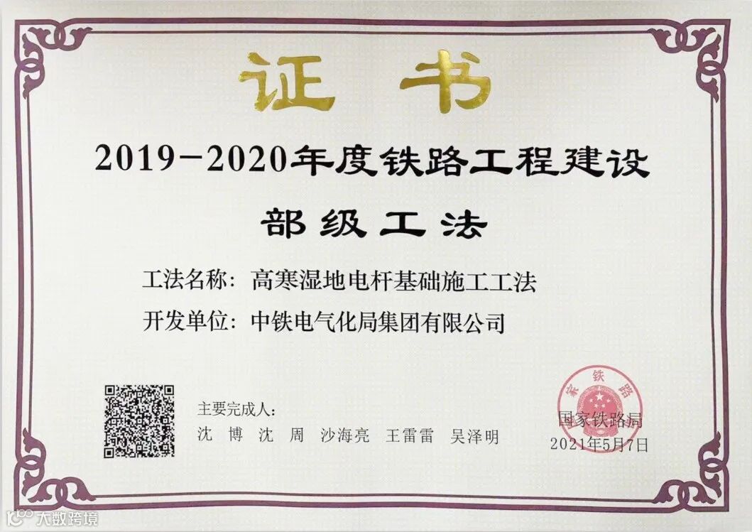《高寒湿地电杆基础施工工法》利用冬季土壤冻结,采用螺旋钻机成孔施工技术,填补了国内高寒湿地电力电杆基础施工空白,规范了高寒湿地地区电力工程电杆基础施工程序和方法,对铁路“四电”行业的此类基础施工有很强的指导和借鉴意义。该工法获铁路工程建设部级工法。