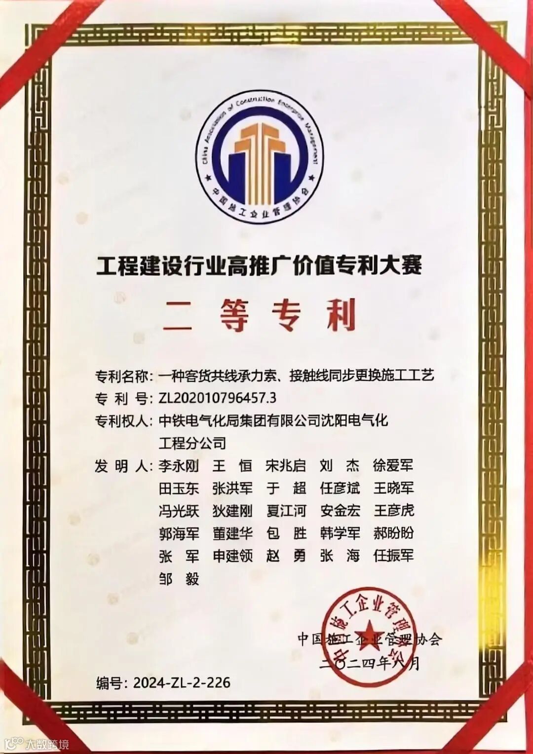 《一种客货共线承力索、接触线同步更换施工工艺》通过对传统施工方案优化、整合,增加了平行作业工序数量,提高了封锁天窗利用率,避免了既有锚柱顺线路方向荷载等安全隐患,减少了作业人员高空作业次数和时长。该发明专利获中国施工企业管理协会工程建设行业高推广价值专利大赛二等专利。
