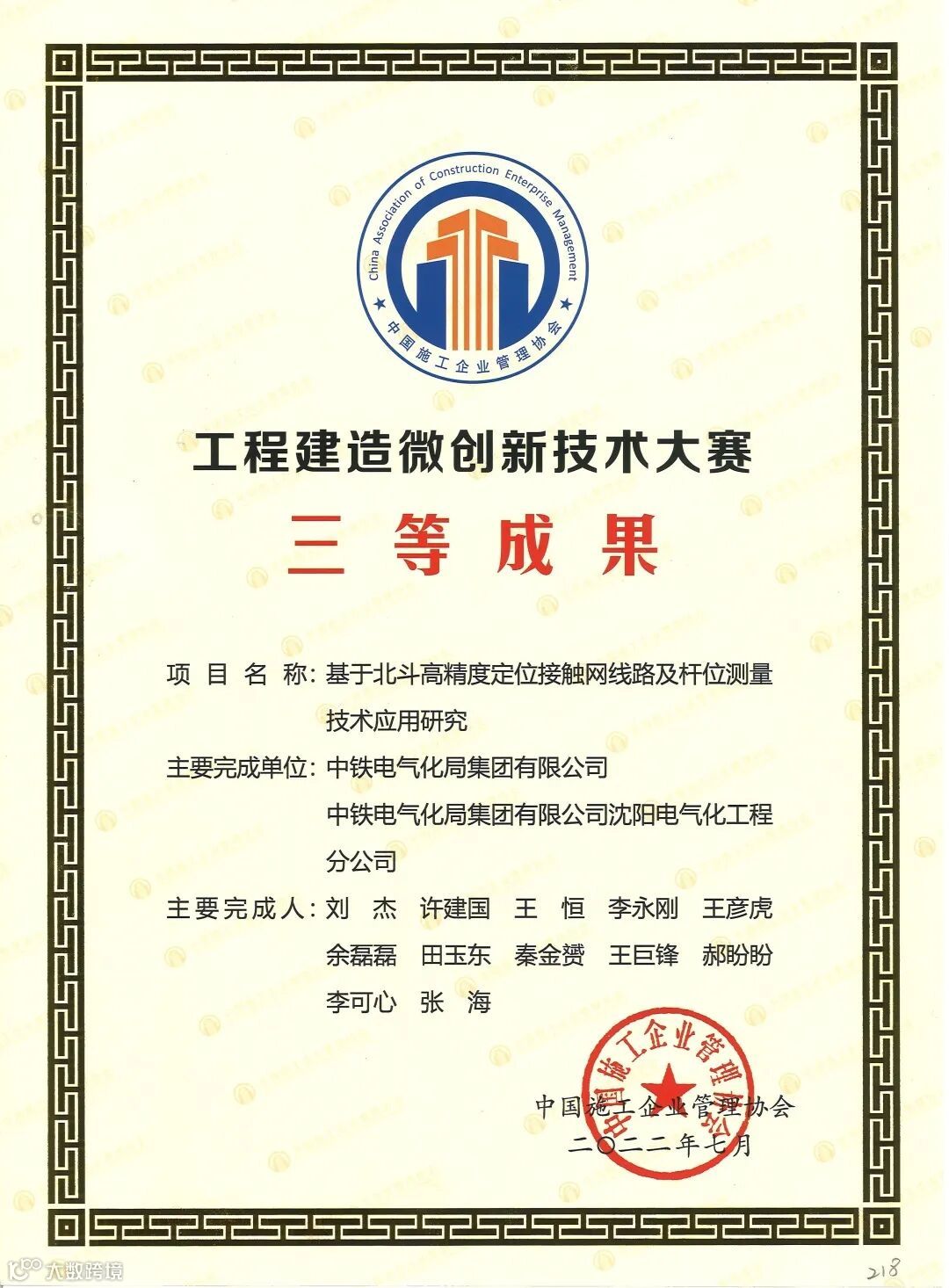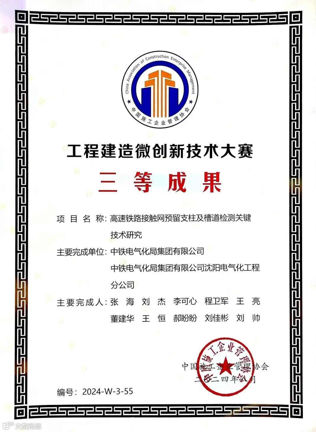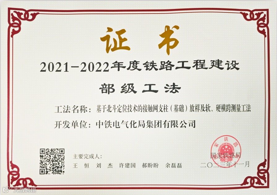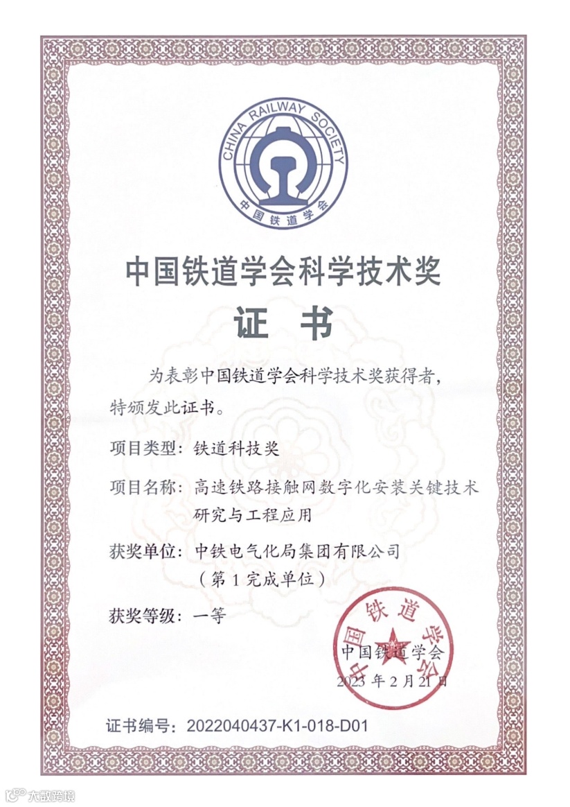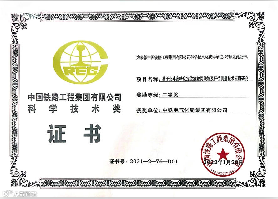 其中,《高速铁路接触网关键结构安全智能识别系统》(《高速铁路接触网数字化安装关键技术研究与工程应用》子课题)《高速铁路四电精品工程细部设计和工艺创新及应用》先后获得中国铁道学会铁道科技奖一等奖;《基于北斗高精度定位接触网线路及杆位测量技术应用研究》成果,获中国铁路工程集团有限公司科学技术奖二等奖、中国施工企业管理协会工程建造微创新技术大赛三等成果;《高速铁路接触网预留支柱及槽道检测关键技术研究》获中国施工企业管理协会工程建造微创新技术大赛三等成果。