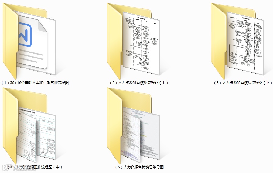 涵盖了:员工入离职/招聘培训流程/薪酬操作流程/绩效管理考核以及评估/考勤社保休假劳动合同档案等流程+六大模块思维导图。