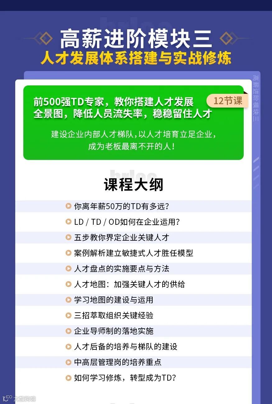 课程包含了OD组织发展、HRBP、TD人才发展体系搭建三大模块,6位名师、15年经验以上的HRD耗时整整一年,潜心研究并实操多个行业案例、反复摸索和总结经验,不断打磨开发出来“HR高薪专家必修”课程。