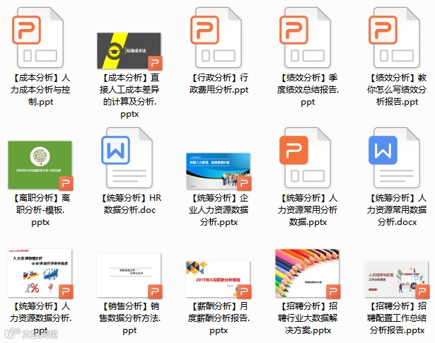 内含:招聘数据分析2份;行政费用分析1份;薪酬、绩效分析各1份;离职分析1份;人力成本分析2份;销售分析1份;人力资源数据统筹分析5份。