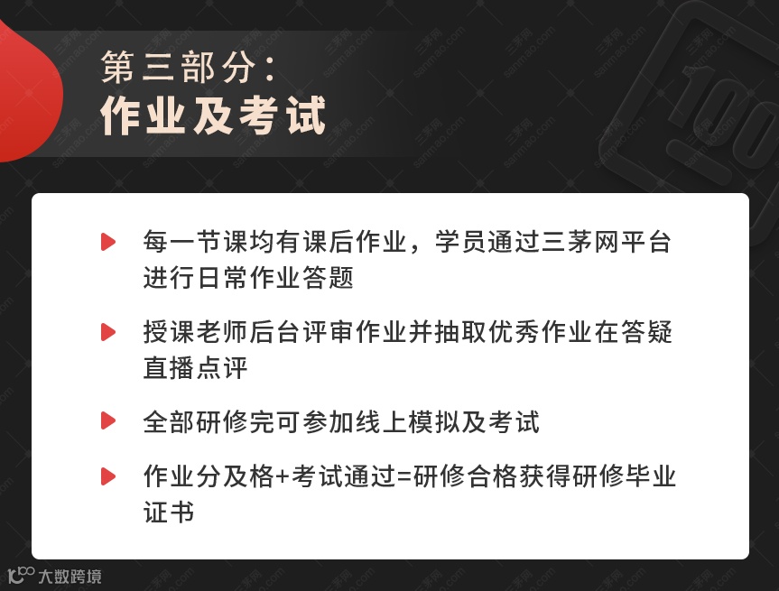 每一节课均有课后作业,可通过三茅平台进行作业练习,授课老师不定期抽查作业,在直播点评;课程结束后进行线上模拟、考试,作业合格+考试合格=毕业证书