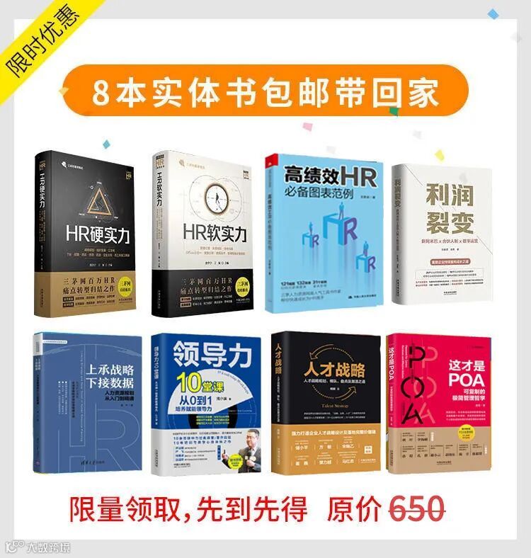 可直接兑换下图8本精品实体书(包邮送到家)以及HR年度咨询法律卡、背调、人才测评等产品和服务。