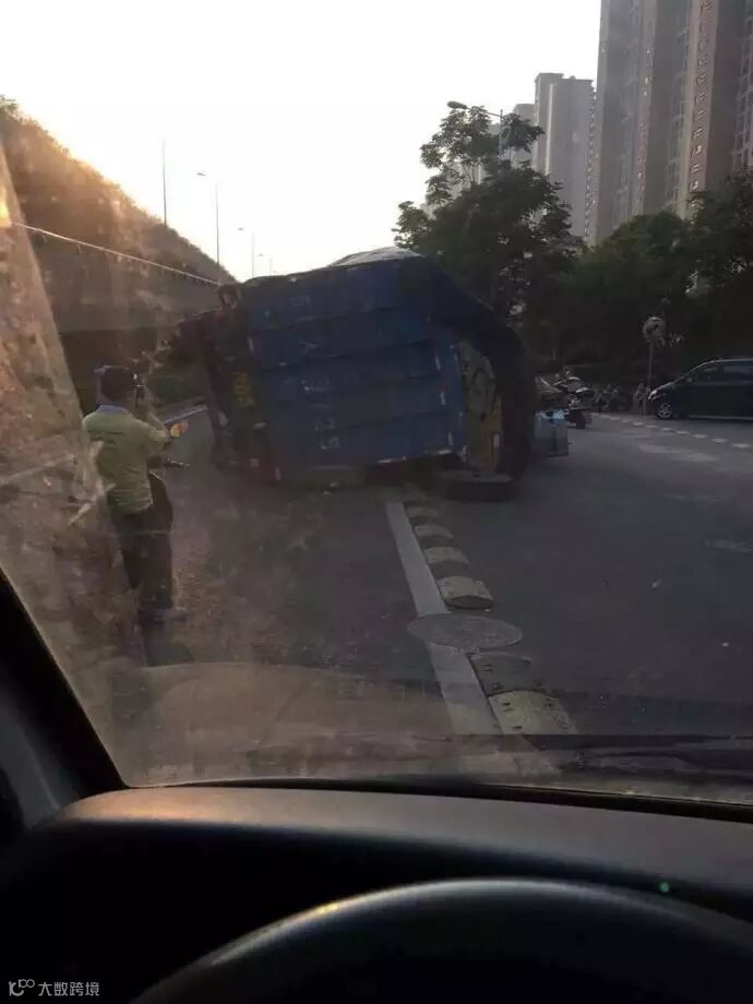 补胎的过程中,大卡车发生二次爆胎。由于车上货物太重,千斤顶打滑,导致大卡车最后侧翻。所幸,在此过程中并未造成人员伤亡。