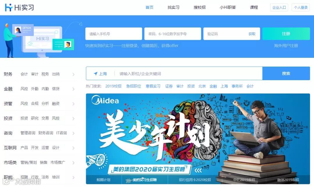 1、Hi实习官网:100万+大学生注册用户,覆盖985/211、本硕、专科等。